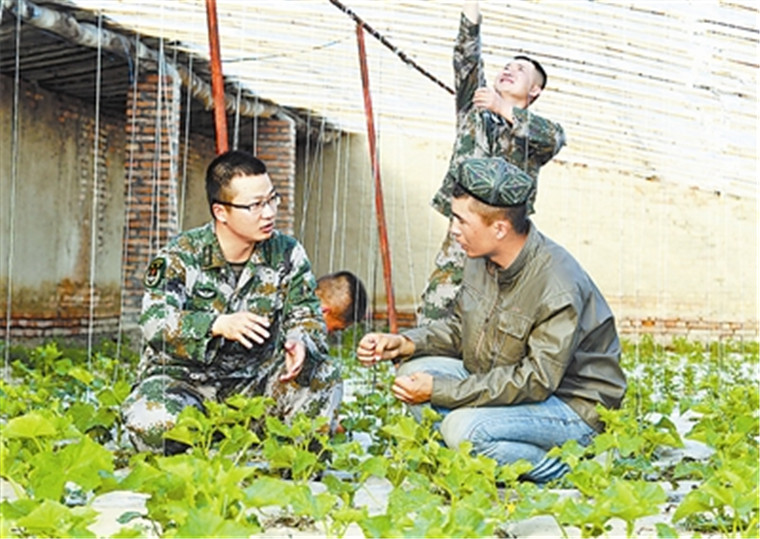 扶贫工作小组官兵帮助少数民族群众种植大棚蔬菜。张银春 摄