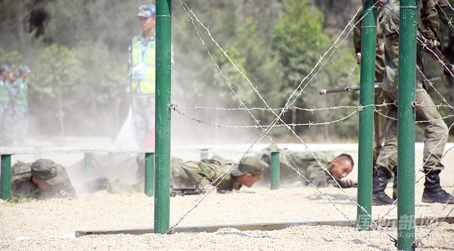 俄罗斯参赛队员通过低桩铁丝网。焦国庆 摄