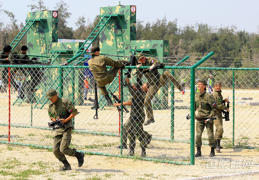 俄罗斯参赛队员翻越标准围墙。尚文斌 摄