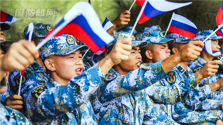 中国海军陆战队员为俄罗斯队员加油鼓劲。孙宏韬 摄