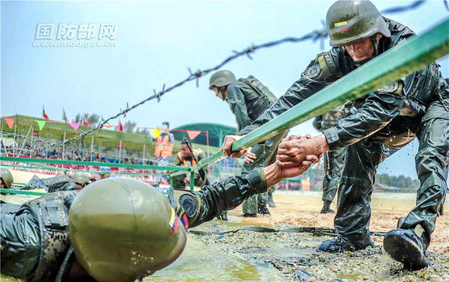 委内瑞拉参赛队员通过低桩铁丝网。孙宏韬 摄