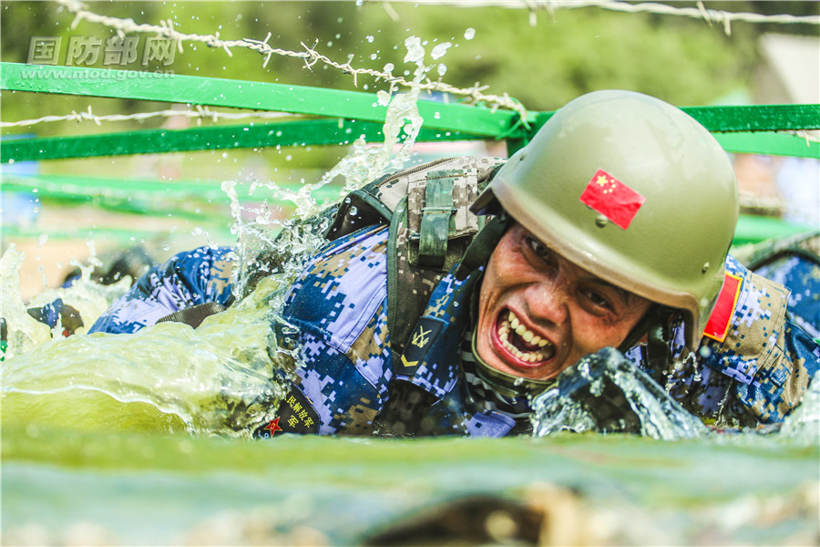 中国参赛队员通过低桩铁丝网。孙宏韬 摄