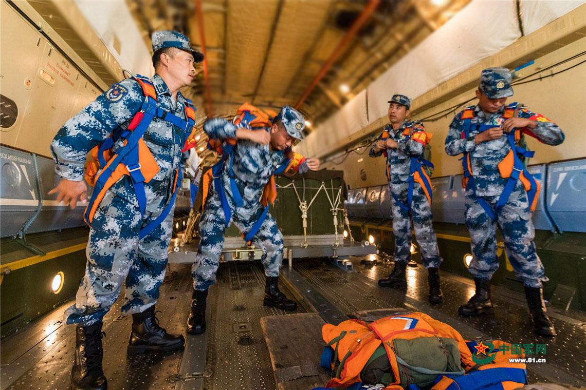 重装空投前,空投员穿上应急伞。杨盼 摄