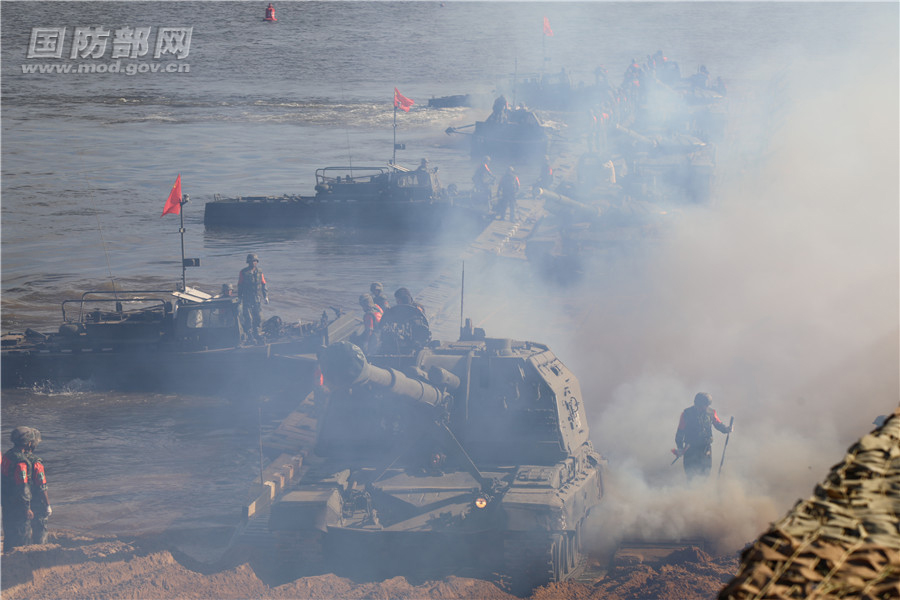 中国参赛队渡送的重型装备冲击上陆。虞平 摄