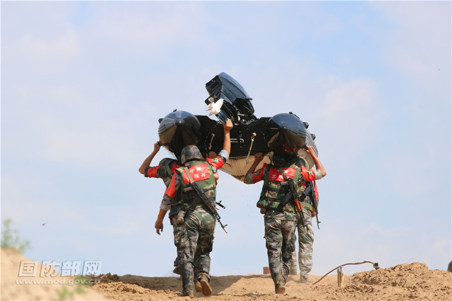 中国参赛队的工兵班肩抗橡皮舟奔赴赛场。李刚 摄