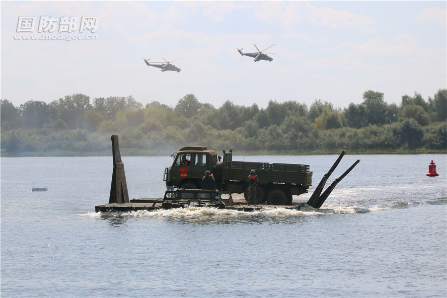 中国参赛队自行舟桥在渡送弹药车。李刚 摄