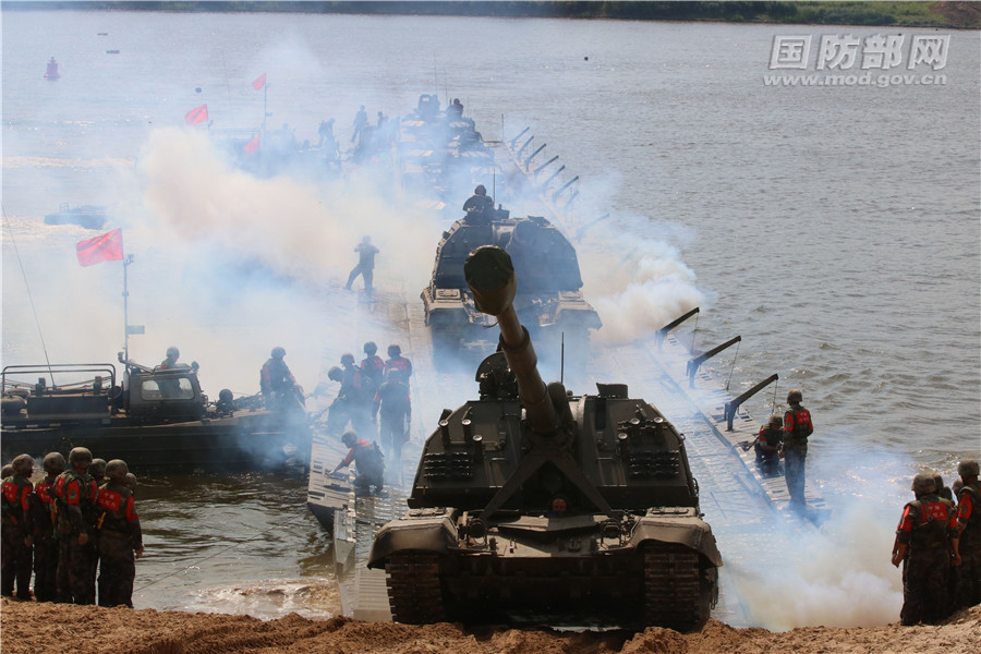 中国参赛队连级门桥渡送重型装备。图为靠岸后,俄方驾驶员驾驶重型装备上岸。李刚 摄