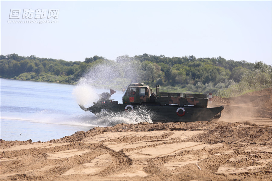 中国参赛队两栖输送车快速入水机动。虞平 摄