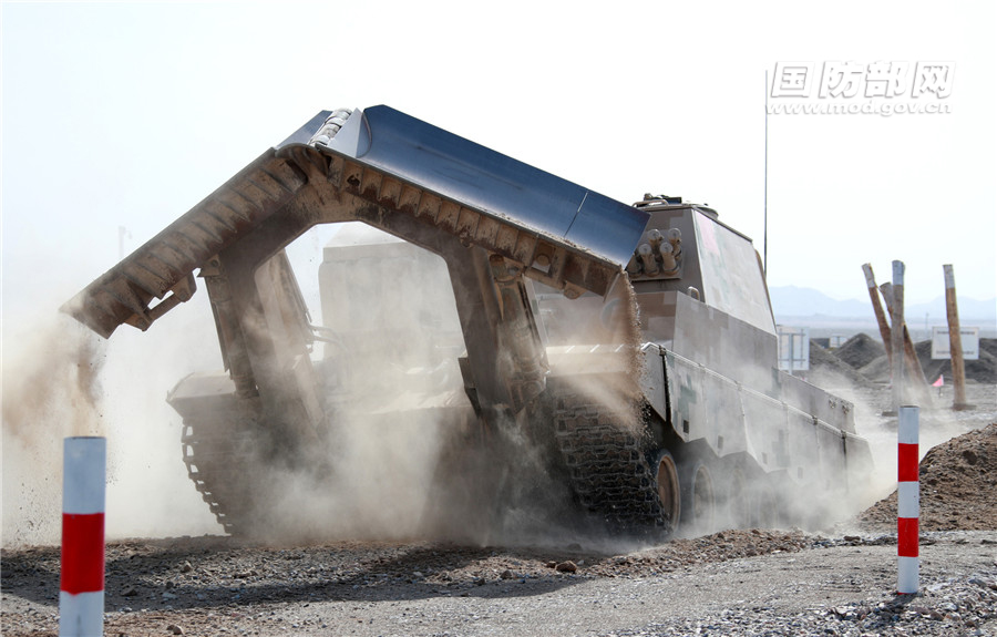 中参赛官兵驾驶多用途工程车展开清障作业。袁凯 摄