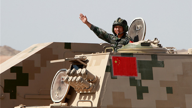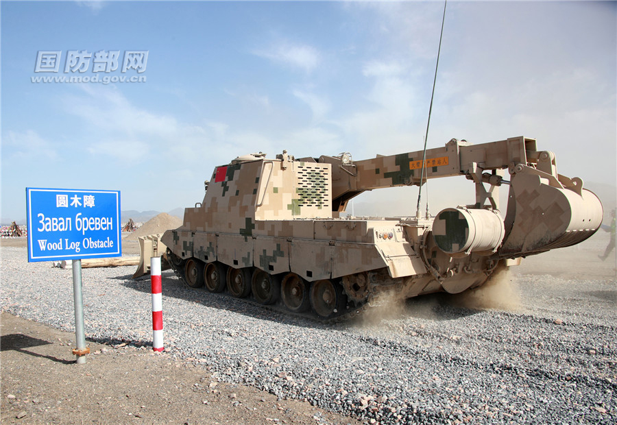 中方参赛官兵驾驶多用途工程车即将展开清障作业。袁凯 摄