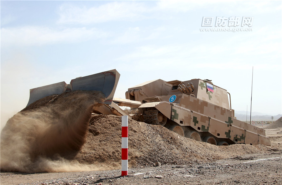 外军参赛队员驾驶多用途工程车展开作业。袁凯 摄