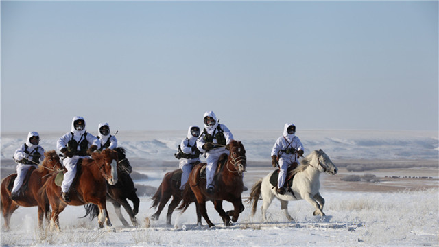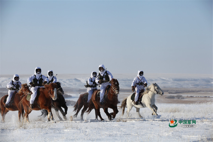 北部战区陆军某边防旅在茫茫雪原展开骑乘训练。陈在林 摄