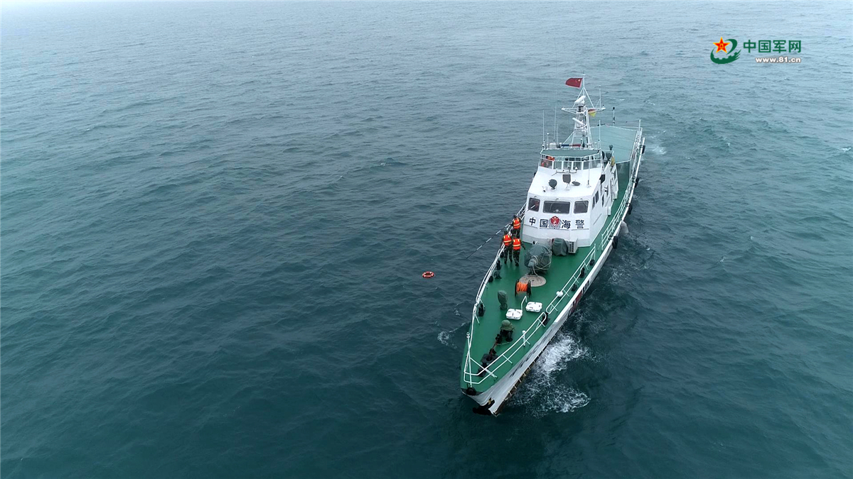 海警舰艇进行海上救助(落水人员)演练。