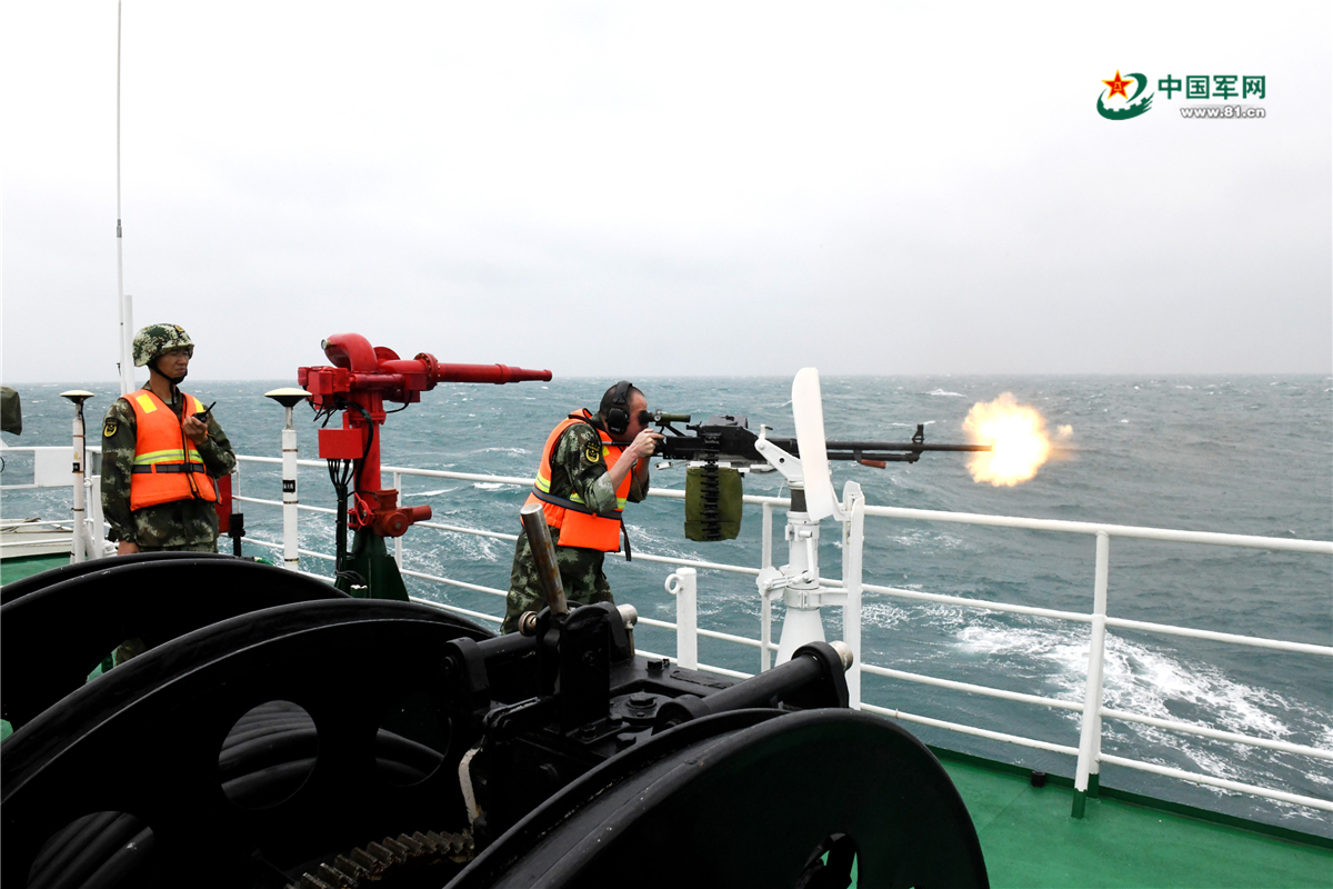 海警官兵进行12.7毫米机枪射击。