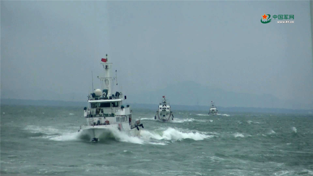 海警舰艇大风浪航行。