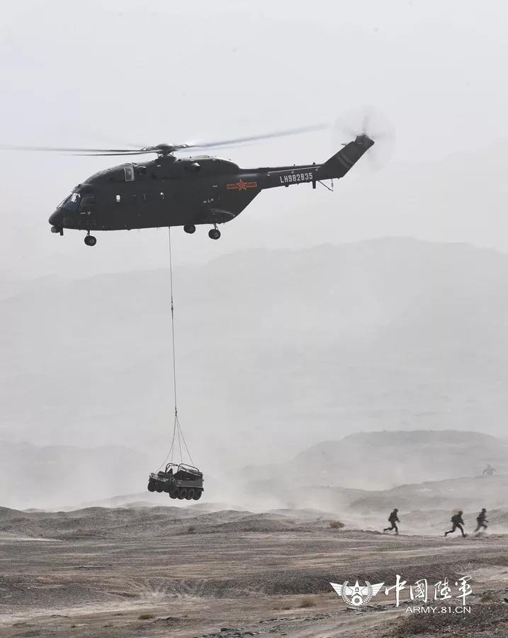 ▲5月23日,空中突击群夺控目标演练中,直升机将全地形车和突击队员运送至作战地域。