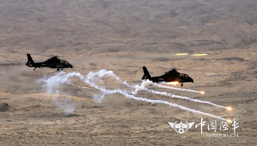 ▲空中突击群夺控目标演练中,空中火力对目标实施攻击。