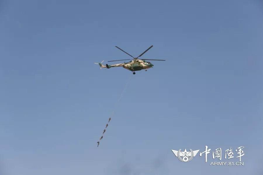 ▲特种作战课目演练中,直升机悬吊特战队员撤离。