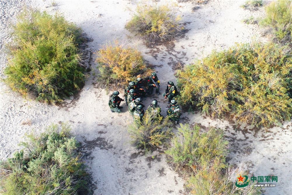 山林地捕歼课目训练中,特战官兵高度警惕、组织严密,听到导调组发出情况通报后,迅速集合人员,制定方案,按照计划分组,有效展开一线搜捕,最后将“犯罪分子”围堵至一独立废弃房屋内。趁“嫌犯”懈怠之际,指挥员果断下达强行突入的命令。特战队员们配合默契,以迅雷不及掩耳之势,破门而入,抓获“嫌犯”。