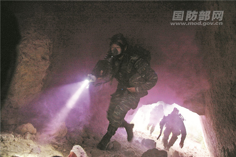 在小队战术类别课目比武中,特战队员穿越染毒山洞。