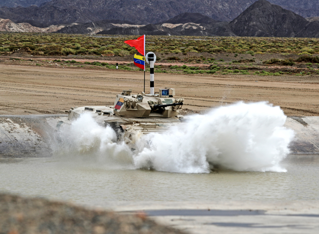 8月30日,“国际军事比赛—2021”中国库尔勒赛区“苏沃洛夫突击”项目举行最后一次单车赛,委内瑞拉参赛队通过涉水场。 罗兴仓 摄