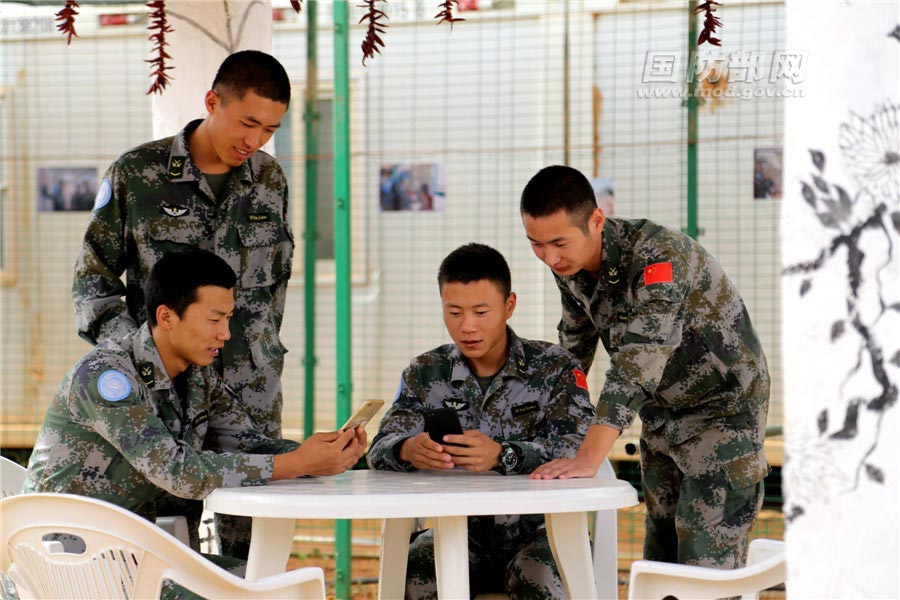当地时间3月17日,中国第5批赴马里维和部队官兵通过手机浏览两会新闻。