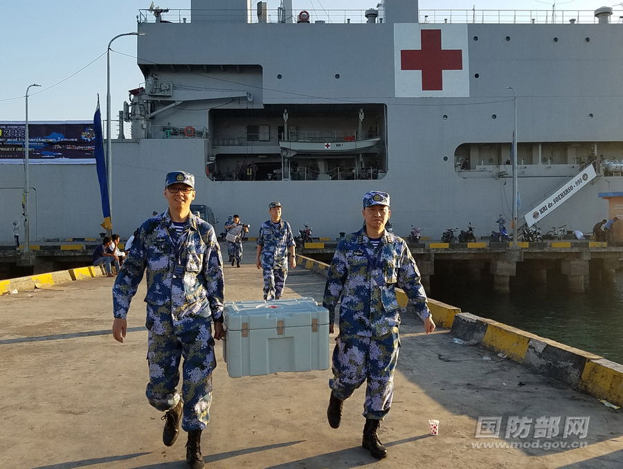 医疗组人员从印尼医院船下来参加陆上救援。刘大同 摄
