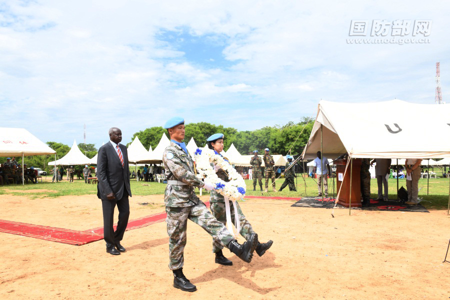 当地时间5月29日,联南苏团在南苏丹首都朱巴举行第16个国际维和人员日纪念仪式,中国第4批赴南苏丹维和步兵营部分官兵参加此次活动。图为南苏丹政府官员向牺牲的维和官兵献花圈。王岸鸿 摄