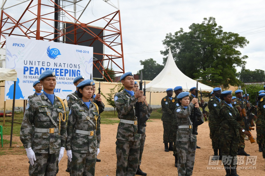 当地时间5月29日,联南苏团在南苏丹首都朱巴举行第16个国际维和人员日纪念仪式,中国第4批赴南苏丹维和步兵营部分官兵参加此次活动。图为中国仪仗兵行举枪礼。王岸鸿 摄