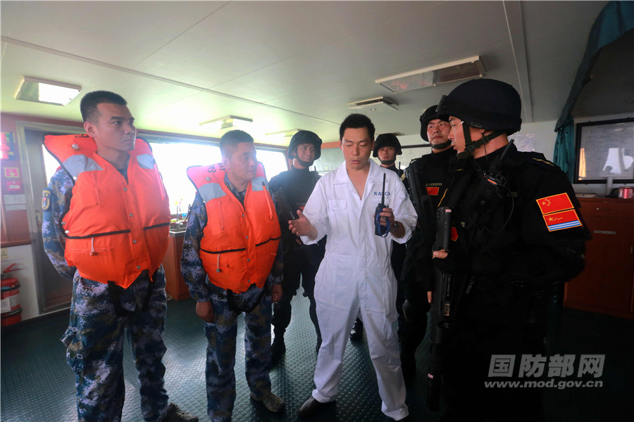船长向特战队员介绍商船整体情况。张千 摄