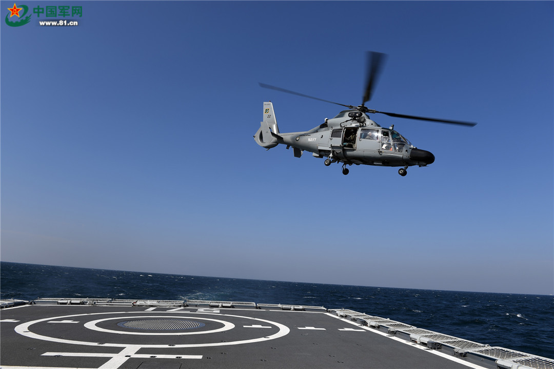 当地时间1月10日,“海洋卫士-2020”中巴海上联合演习在北阿拉伯海域举行舰机协同演练。图为巴方直升机在运城舰上进行起降。记者 穆瑞林 摄
