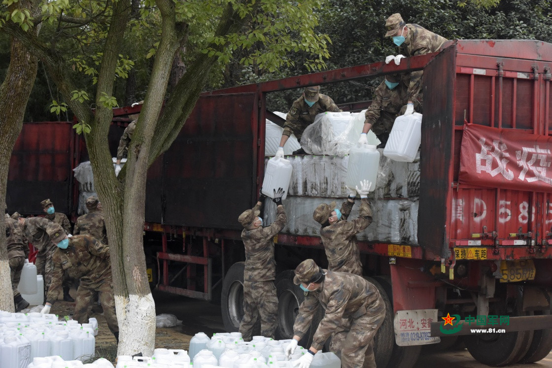 2月10日,邯郸市爱国拥军联合会为火神山医院捐赠的百吨医用消毒原液顺利抵达武汉并予交接,医疗队队员快速搬运医疗物资。中国军网记者 范显海 摄