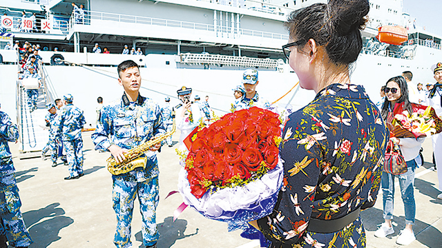 2018-04-05 10:354月4日上午,由滨州舰、徐州舰、千岛湖舰组成的海军第29批护航编队在浙江舟山某军港解缆启航。护航归来,爱情绽放在军港码头:嫁给我吧!