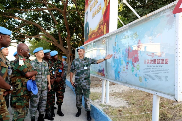 中国维和部队指挥长为来宾宣讲“一带一路”常识。杨双权 摄