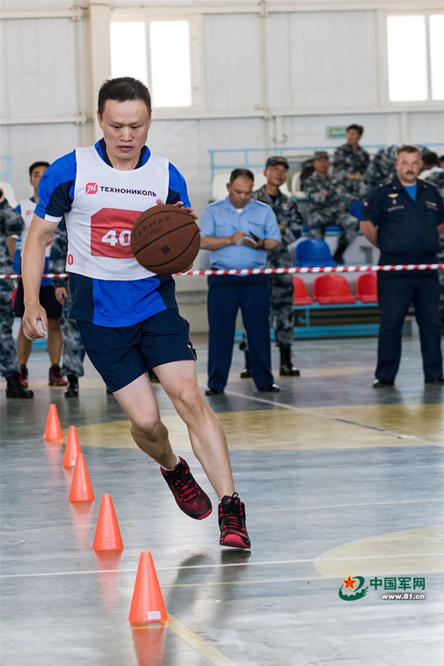 中国空军飞行员邱坤进行篮球综合比赛。杨盼 摄