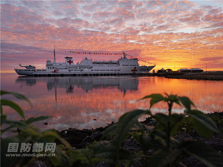 8月19日,首个“中国医师节”,在汤加努库阿洛法港,沐浴朝霞的中国海军和平方舟医院船。江山 摄