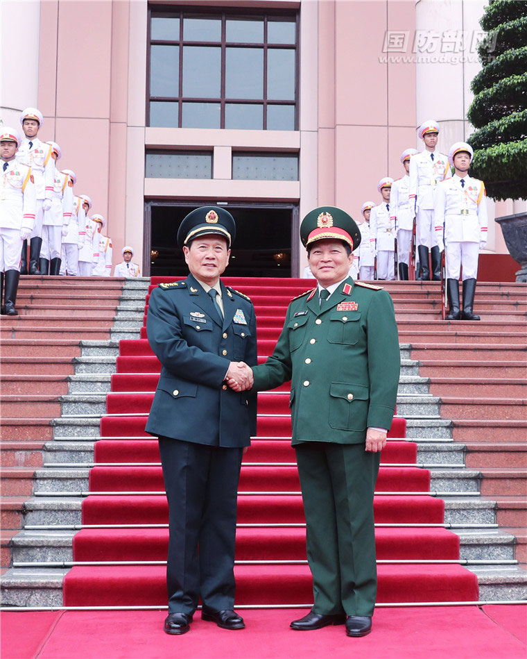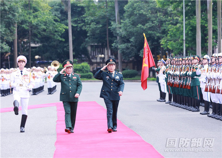 5月27日,国务委员兼国防部长魏凤和与越南国防部长吴春历举行会谈。会谈前,吴春历为魏凤和举行欢迎仪式并陪同检阅越三军仪仗队。李晓伟 摄