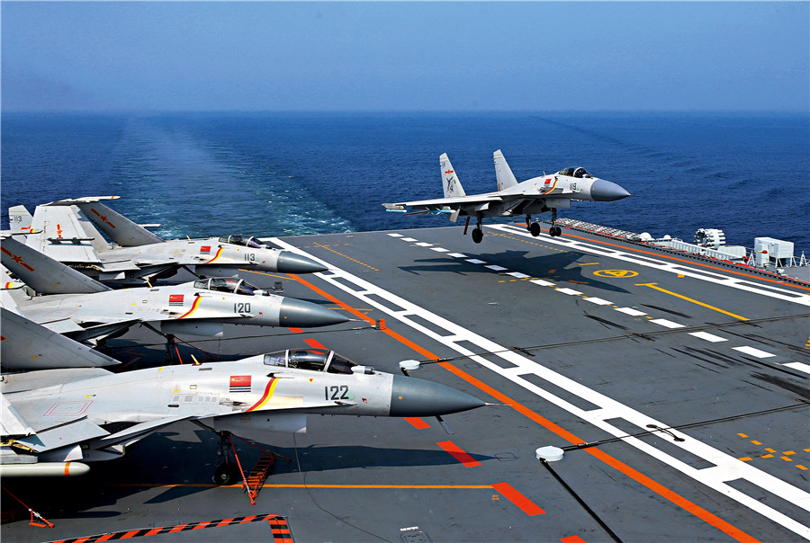 歼-15舰载战斗机在辽宁舰着舰。