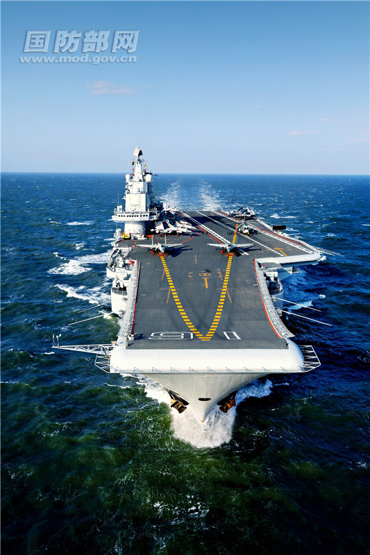 海军辽宁舰劈波斩浪开展训练。