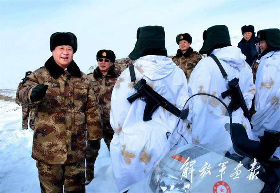 2014年1月26日,习主席在阿尔山口岸亲切慰问正在执勤的内蒙古军区边防某团一连摩托雪橇巡逻队官兵。