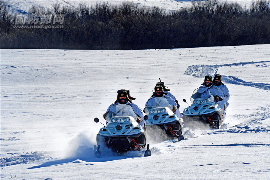 一连摩托雪橇巡逻队在边防巡逻。