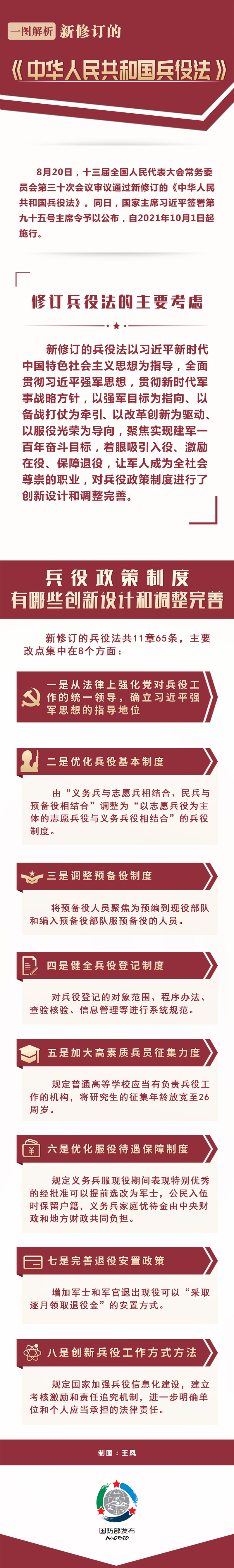 新修订的兵役法共11章65条,主要改点集中在8个方面:一是从法律上强化党对兵役工作的统一领导,确立习近平强军思想的指导地位;二是优化兵役基本制度,由“义务兵与志愿兵相结合、民兵与预备役相结合”调整为“以志愿兵役为主体的志愿兵役与义务兵役相结合”的兵役制度;三是调整预备役制度,将预备役人员聚焦为预编到现役部队和编入预备役部队服预备役的人员;四是健全兵役登记制度,对兵役登记的对象范围、程序办法、查验核验、信息管理等进行系统规范;五是加大高素质兵员征集力度,规定普通高等学校应当有负责兵役工作的机构,将研究生的征集年龄放宽至26周岁;六是优化服役待遇保障制度,规定义务兵服现役期间表现特别优秀的经批准可以提前选改为军士,公民入伍时保留户籍,义务兵家庭优待金由中央财政和地方财政共同负担;七是完善退役安置政策,增加军士和军官退出现役可以“采取逐月领取退役金”的安置方式;八是创新兵役工作方式方法,规定国家加强兵役信息化建设,建立考核激励和责任追究机制,进一步明确单位和个人应当承担的法律责任。