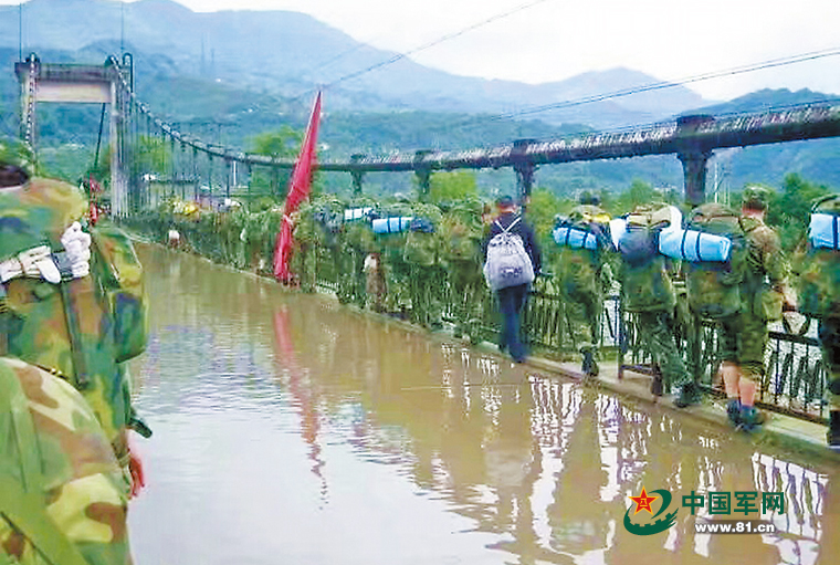 “铁军”官兵沿着损坏的铁索桥向重灾区挺进,背囊里塞着的就是准备清理废墟使用的一打手套。