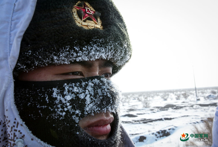 天寒地冻,执勤官兵防寒面罩、棉帽上凝结了冰霜。(资料图)