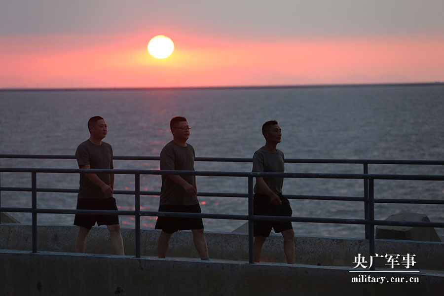 接替王继才的三名哨兵迎着夕阳在岛上巡逻。李建峰摄