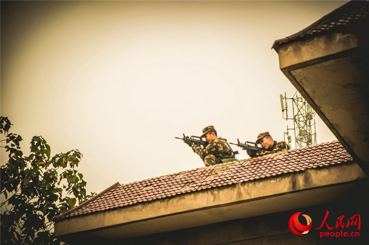 突击组在屋顶观察情况。