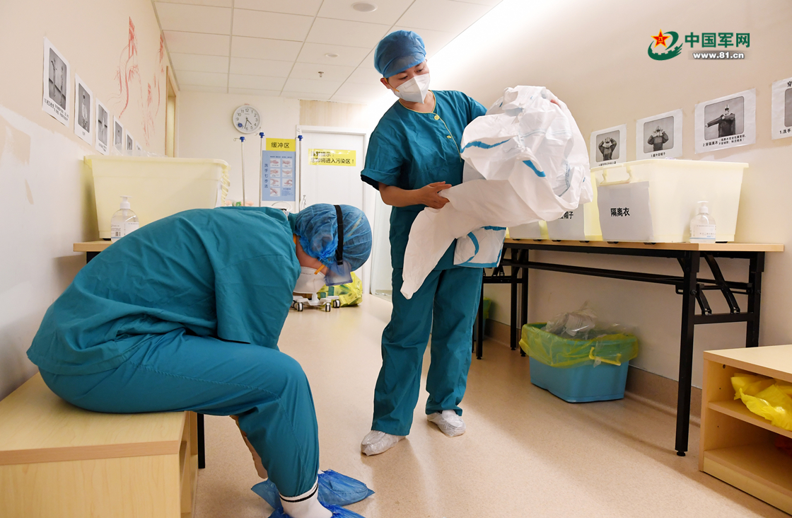 进入病房前,路美(右一)认真准备防护装具。