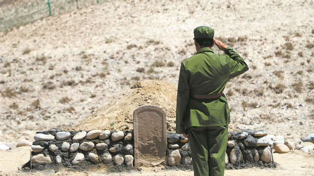 近日,新疆军区某团官兵和驻地相关部门工作人员、志愿者一起到北阳山修缮烈士墓群。