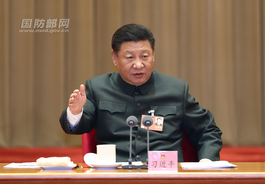 3月12日上午,中共中央总书记、国家主席、中央军委主席习近平出席十三届全国人大一次会议解放军和武警部队代表团全体会议并发表重要讲话。周朝荣 摄