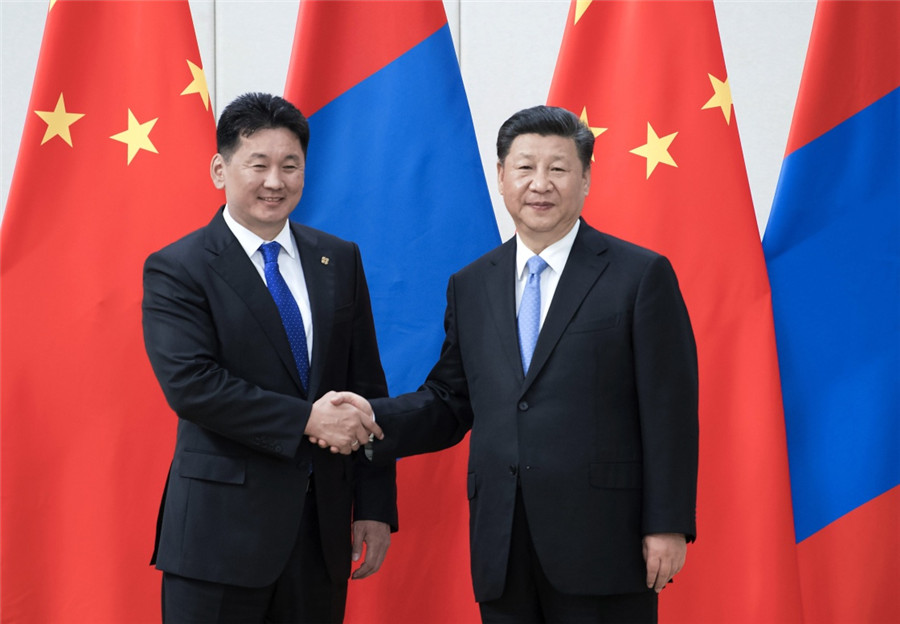 习近平指出,中方始终将中蒙关系放在周边外交重要位置。我们将推动建设人类命运共同体,继续按照亲诚惠容理念和与邻为善、以邻为伴的周边外交方针,深化同蒙古国的关系。当前,中蒙关系处在新的历史阶段。双方要本着互信、合作、共赢原则,抓住机遇,推动中蒙全面战略伙伴关系向前发展。